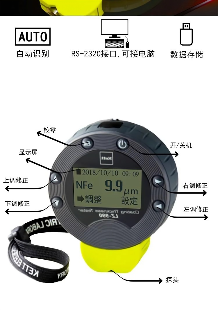 日本KETT凱特測厚儀LZ-990一體式雙功能,可無損的測量磁性金屬基體(如鐵、合金和硬磁性鋼等)上非磁性覆層的厚度(如銅、鋁、鉻、琺瑯、橡膠、油漆等)及非磁性金屬基體(如銅、鋁、鋅、錫等)上的非導電覆層的厚度(如琺瑯、橡膠、油漆、塑料等)。