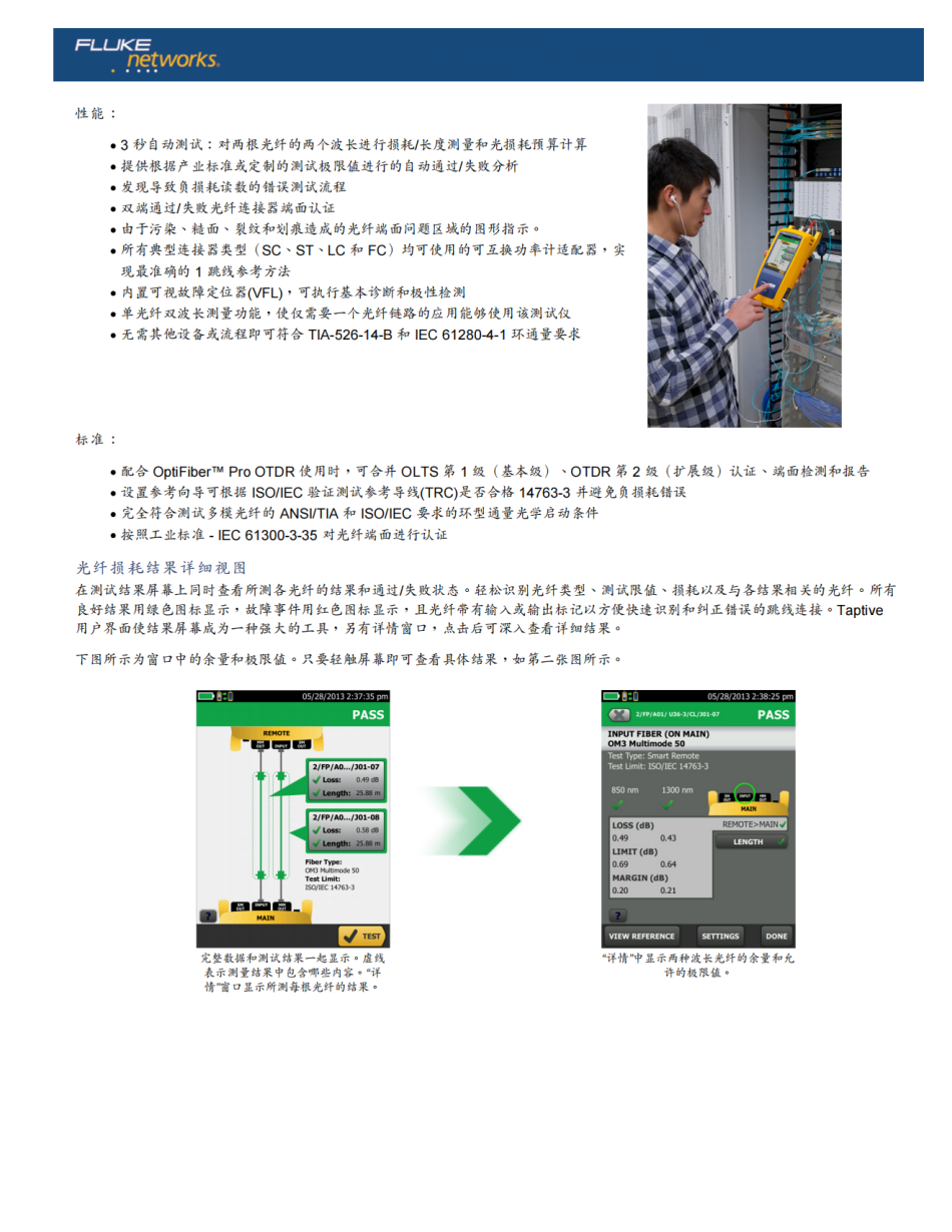 提供根據(jù)產(chǎn)業(yè)標(biāo)準(zhǔn)或定制的測(cè)試極限值進(jìn)行的自動(dòng)通過/失敗分析 發(fā)現(xiàn)導(dǎo)致負(fù)損耗讀數(shù)的錯(cuò)誤測(cè)試流程雙端通過/失敗光纖連接器端面認(rèn)證由于污染、糙面、裂紋和劃痕造成的光纖端面問題區(qū)域的圖形指示。所有典型連接器類型(SC、ST、LC 和 FC)均可使用的可互換功率計(jì)適配器,實(shí)現(xiàn)*準(zhǔn)確的 1 跳線參考方法內(nèi)置可視故障定位器(VFL),可執(zhí)行基本診斷和極性檢測(cè)單光纖雙波長(zhǎng)測(cè)量功能,使僅需要一個(gè)光纖鏈路的應(yīng)用能夠使用該測(cè)試儀無需其他設(shè)備或流程即可符合 TIA-526-14-B 和 IEC 61280-4-1 環(huán)通量要求完整數(shù)據(jù)和測(cè)試結(jié)果一起顯示。虛線表示測(cè)量結(jié)果中包含哪些內(nèi)容。“詳情”窗口顯示所測(cè)每根光纖的結(jié)果。“詳情”中顯示兩種波長(zhǎng)光纖的余量和允許的極限值。