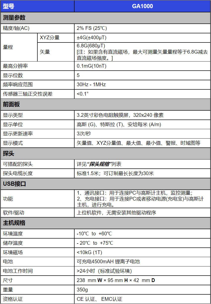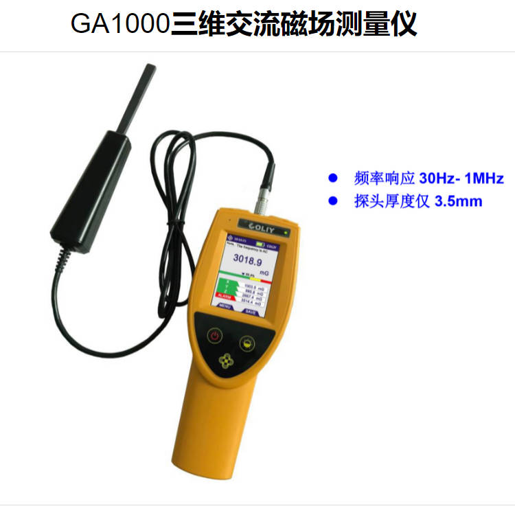 另外,探頭厚度僅僅3.5mm,非常適合測(cè)量狹窄空間的交流磁場(chǎng)。GA1000交流磁場(chǎng)測(cè)量?jī)x用來(lái)測(cè)量交流磁場(chǎng),基本精度2%,分辨率0.1mG(10nT)交流磁場(chǎng)測(cè)量范圍4G/軸(400uT/軸),頻率響應(yīng)范圍30HZ-1MHZ。