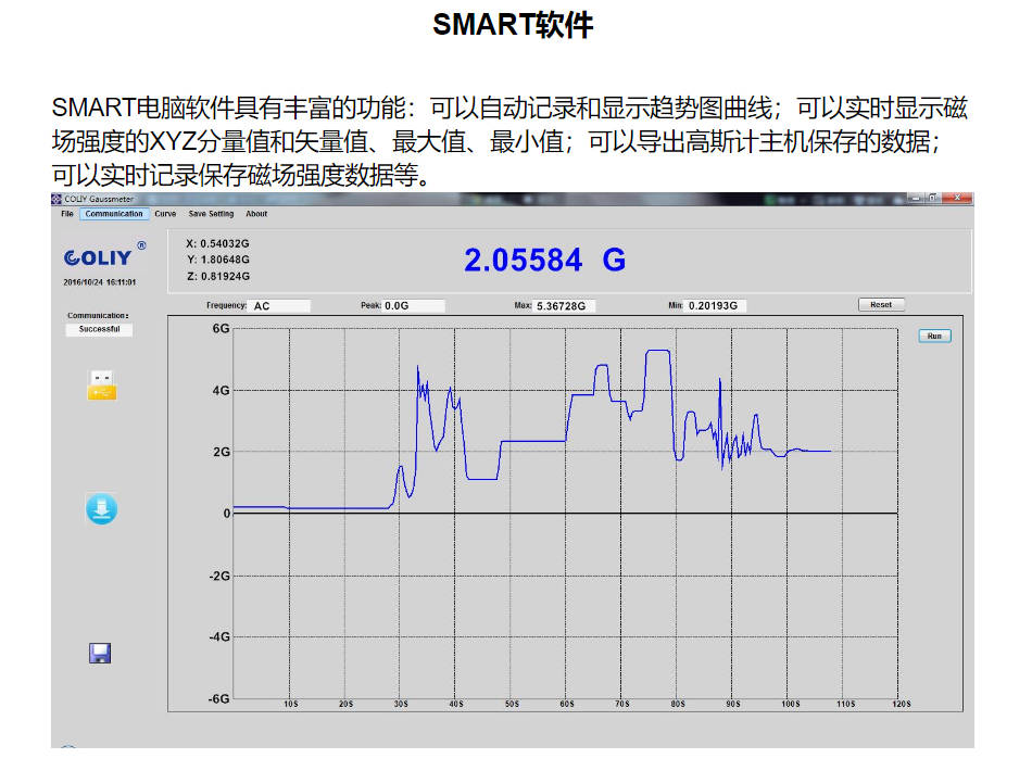 3.2英寸彩色工業(yè)觸摸屏,提供了豐富的顯示內(nèi)容,擁有*大值*小值/保持值/報(bào)警閾值,實(shí)時(shí)磁場(chǎng)強(qiáng)度的XYZ分量值、矢量值以及時(shí)域圖等功能。