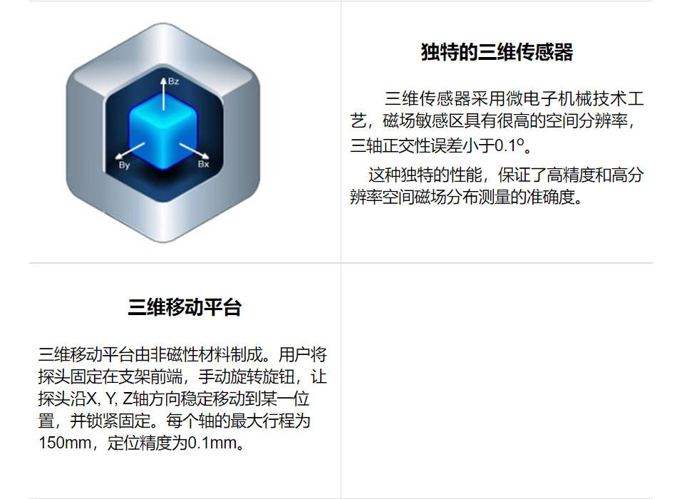 GA1000交流磁場(chǎng)測(cè)量?jī)x的三維探頭具有一個(gè)異常優(yōu)異的特點(diǎn):它的探頭傳感器采用了微電子機(jī)械制造工藝,具有很高的空間分辨率,三軸正交性誤差小于0.1°),保證了高精度和