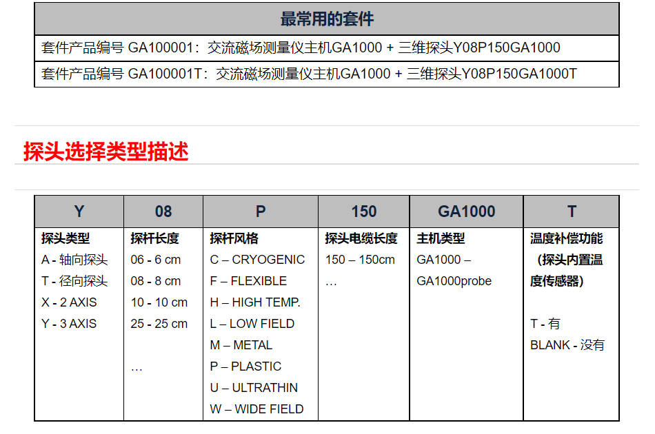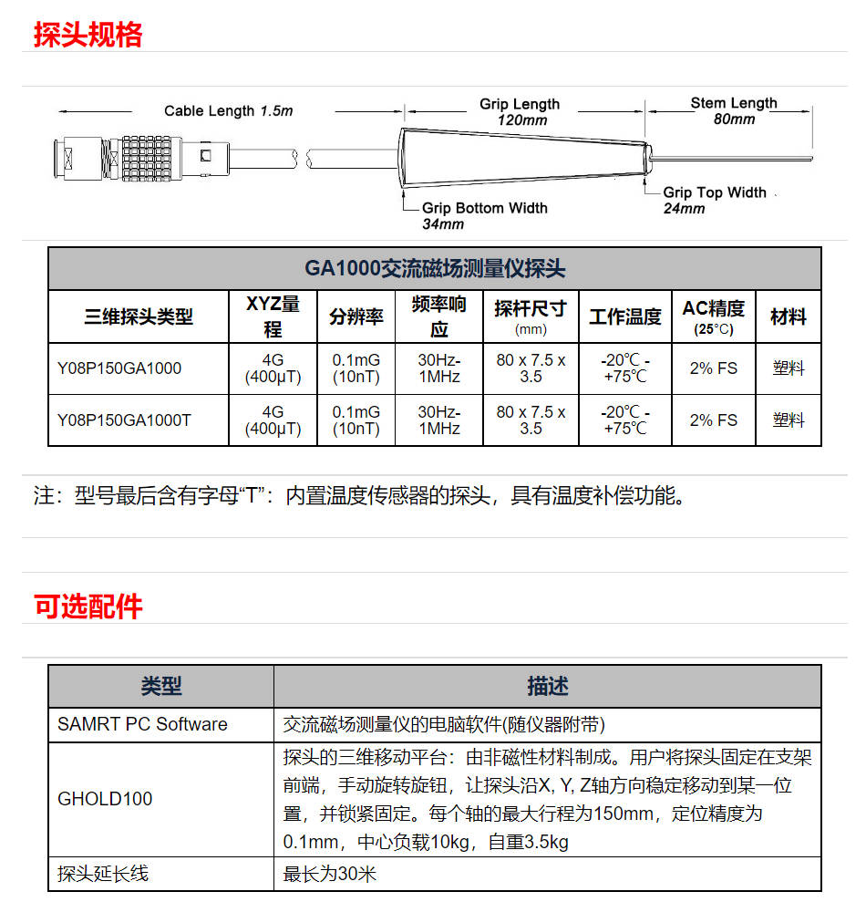 用戶(hù)可以選擇更多種不同類(lèi)型的探頭:標(biāo)準(zhǔn)三維探頭、標(biāo)準(zhǔn)二維探頭以及內(nèi)置溫度傳感器的探頭。內(nèi)置溫度傳感器的探頭具有溫度補(bǔ)償功能;在溫度變化時(shí),可以提高測(cè)量數(shù)據(jù)的精度和穩(wěn)定性,因此強(qiáng)烈建議用戶(hù)選擇內(nèi)置溫度傳感器的探頭與GA1000交流磁場(chǎng)測(cè)量?jī)x搭配使用。