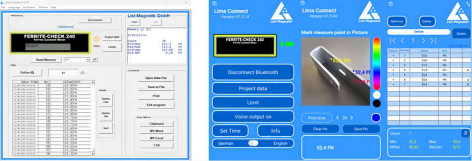 為了進(jìn)一步處理測量數(shù)據(jù),您可以將FERRITE-CHECK 140鐵素體含量檢測儀與移動(dòng)Android和iOS設(shè)備配對;蛘吲c一臺Windows電腦通信。這是由低功耗藍(lán)牙技術(shù)(BLE)實(shí)現(xiàn)的。使用Lima Connect應(yīng)用程序,您可以管理項(xiàng)目并在照片上分配測量點(diǎn)。測量結(jié)果可以統(tǒng)計(jì)評估和圖形顯示。這款應(yīng)用適用于安卓、iOS和Windows系統(tǒng),軟件免費(fèi)的。