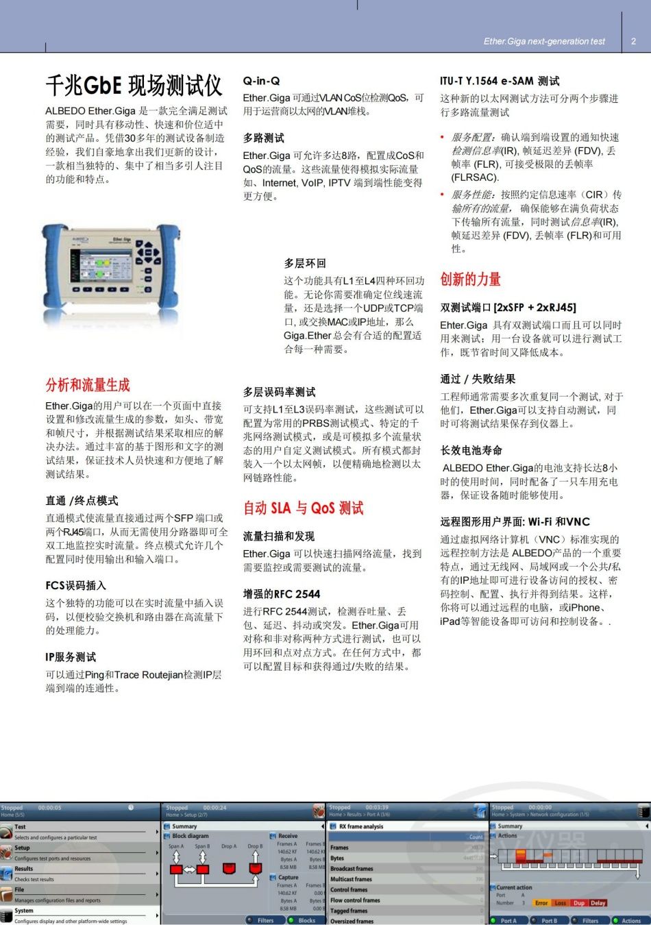 ALBEDO Ether.Giga是一款便攜式、經(jīng)濟實用但是功能豐富的千兆以太網(wǎng)測試產(chǎn)品,Ether.Giga不但具有誤碼率測試和RFC2544等常見功能,還支持Y.1564,Y.1731和FCS錯誤插入等新功能,因此能夠驗證新的多方服務的QoS和SLA。設(shè)備配備了雙SFP光口和雙RJ45測試接口,以及4.2英寸彩色觸摸屏,現(xiàn)場技術(shù)人員可快速,輕松地驗證以太網(wǎng)服務并對其進行故障排除,適用于包括VoIP,IPTV,VoD,高性能計算,虛擬化服務,數(shù)據(jù)中心和存儲等需要很高水平的以太網(wǎng)應用帶寬的網(wǎng)絡(luò)環(huán)境。Ether.Giga可以快速掃描網(wǎng)絡(luò)流量以選擇要測試的流量,并選擇是否要監(jiān)視或執(zhí)行任何測試。 因此,不再需要緩慢的設(shè)置或深厚的知識。Ether.Giga的用戶可以依靠即時流量生成設(shè)置,并直接修改標頭,帶寬和幀大小等參數(shù),而無需導航到其他頁面,從而根據(jù)測試范圍為專家提供響應能力。 分析帶來了非常結(jié)構(gòu)化的方式,大量的圖形化測量和結(jié)果,從而確保工程師可以快速輕松地解釋測試結(jié)論。