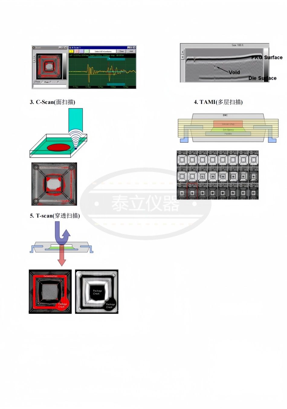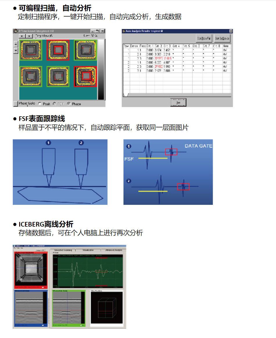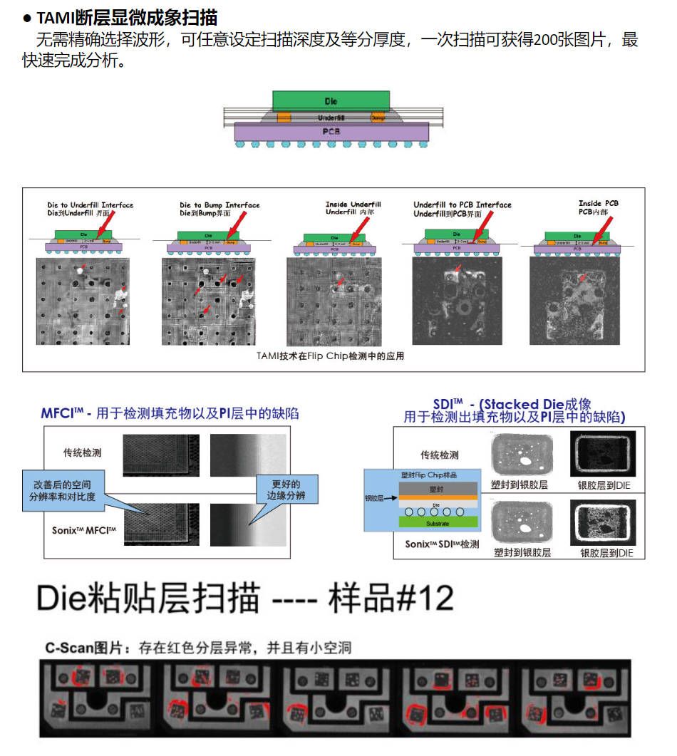 TAMI: 一次掃描可同時(shí)獲得*多 100 張 C 超掃描圖像, 在需要時(shí),可自動(dòng)調(diào)節(jié)焦距,可看到 IC 所有的分界 面,無(wú)需重掃,所有的分界面成像比操作者解釋波形更直觀