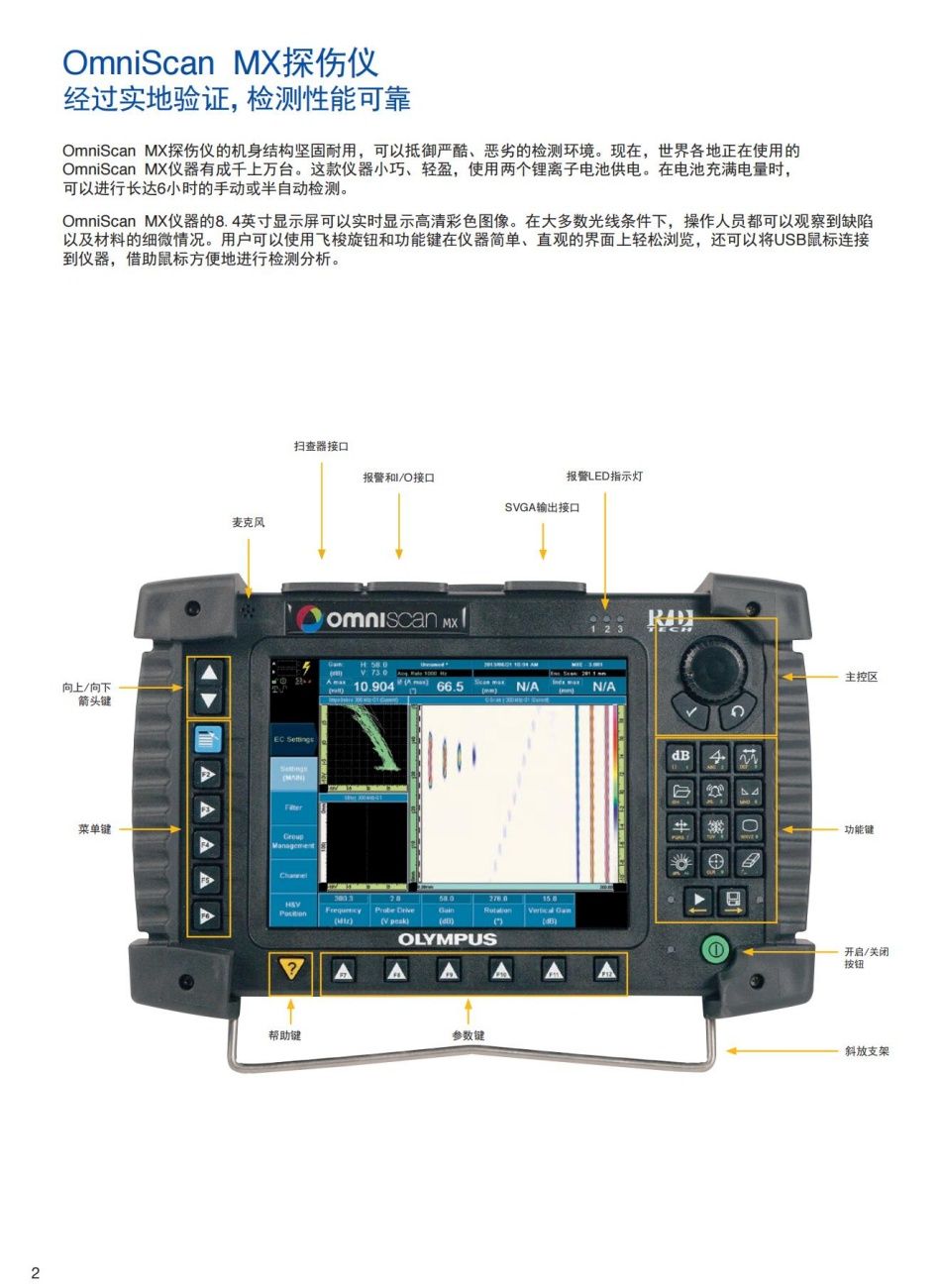 OmniScan MX儀器的8.4英寸顯示屏可以實時顯示高清彩色圖像。在大多數(shù)光線條件下,操作人員都可以觀察到缺陷以及材料的細(xì)微情況。用戶可以使用飛梭旋鈕和功能鍵在儀器簡單、直觀的界面上輕松瀏覽,還可以將USB鼠標(biāo)連接到儀器,借助鼠標(biāo)方便地進(jìn)行檢測分析。