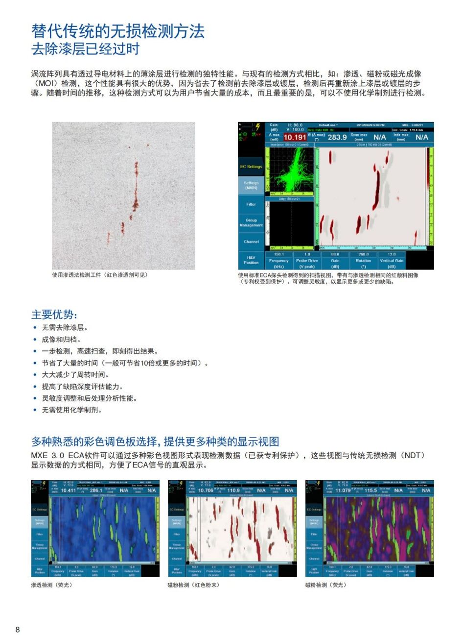 由于渦流陣列和ECT技術(shù)基于相同的基本原理(及物理學(xué)理論),因此渦流陣列技術(shù)也可以透過漆層進(jìn)行檢測,此外,還可以提供渦流陣列(ECA)技術(shù)的優(yōu)勢特性,其中包括:覆蓋范圍大、掃查速度快、檢出概率高,及彩色成像功能。