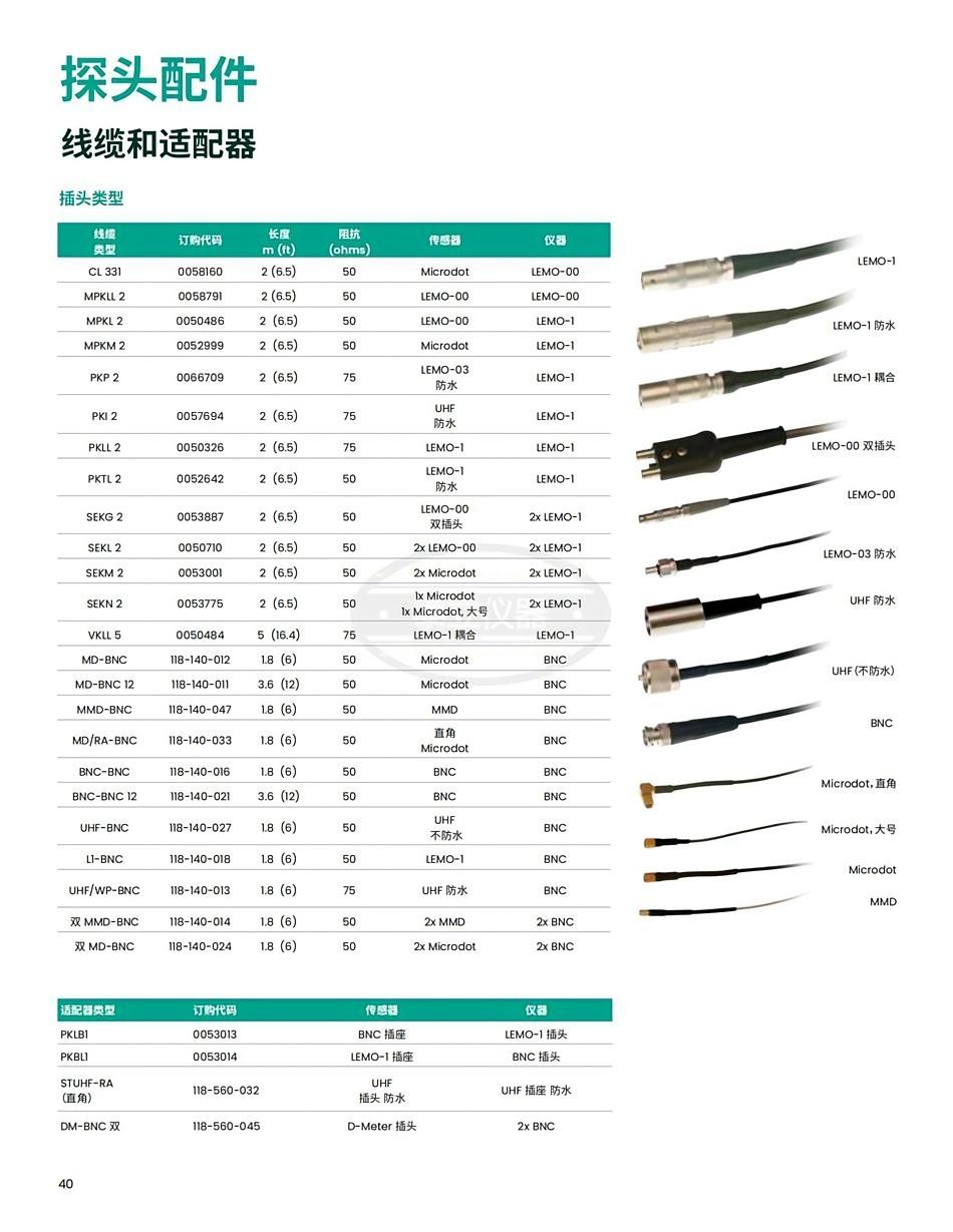 1×Microdo,大Lemo00雙插頭 帶衰減器 KBA535 1.5 50 2×Mini-Lemo Lemo00雙插頭 帶金屬護(hù)套 KBA536 1.5 50 2×Mini-Lemo Lemo00雙插頭 MPKL2 2 50 Lemo00 Lemo1 MPKM2 2 50 Microdot Lemo1 PKBM0.5 0.5 50 Microdot BNC PKP2 2 75 Lemo03 Lemo1 密封水壓60巴 PKI2 2 75 UHF Lemo1 PKLL2 2 75 Lemo1 Lemo1 PKTL2 2 50 Lemo1水密封 Lemo1 密封水壓60巴 SEKG2 2 50 Lemo00雙插頭 2×Lemo1 SEKL2 2 50 2×Lemo00 2×Lemo1 SEKM2 2 50 2×Microdot 2×Lemo1 SEKN2 2 50 1×Microdot