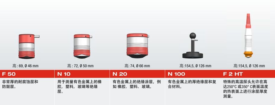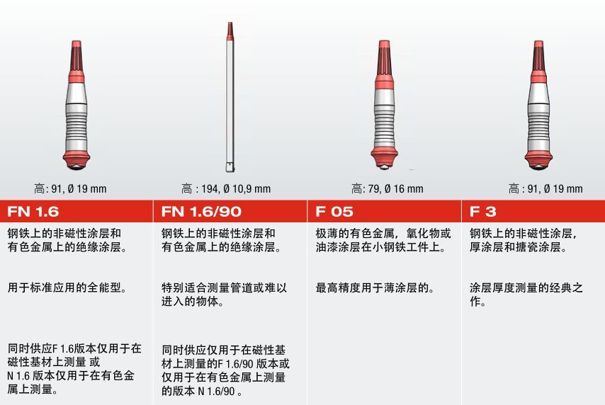 F-型探頭根據(jù)磁感應(yīng)原理工作,可以測(cè)量涂覆在鋼鐵(包括鋼合金和淬硬磁鋼)上的涂料、搪瓷、橡膠、鋁、鉻、銅、鋅等非磁性涂層。