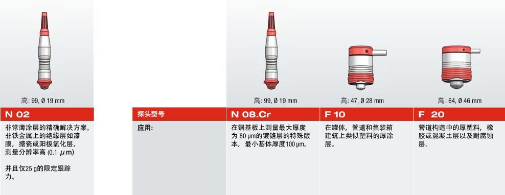 MiniTest 2500/4500 系列涂層測(cè)厚儀提供多種測(cè)量探頭,使其可以處理標(biāo)準(zhǔn)應(yīng)用以及更復(fù)雜的測(cè)量任務(wù)。應(yīng)用范圍由連接到主機(jī)的探頭決定: