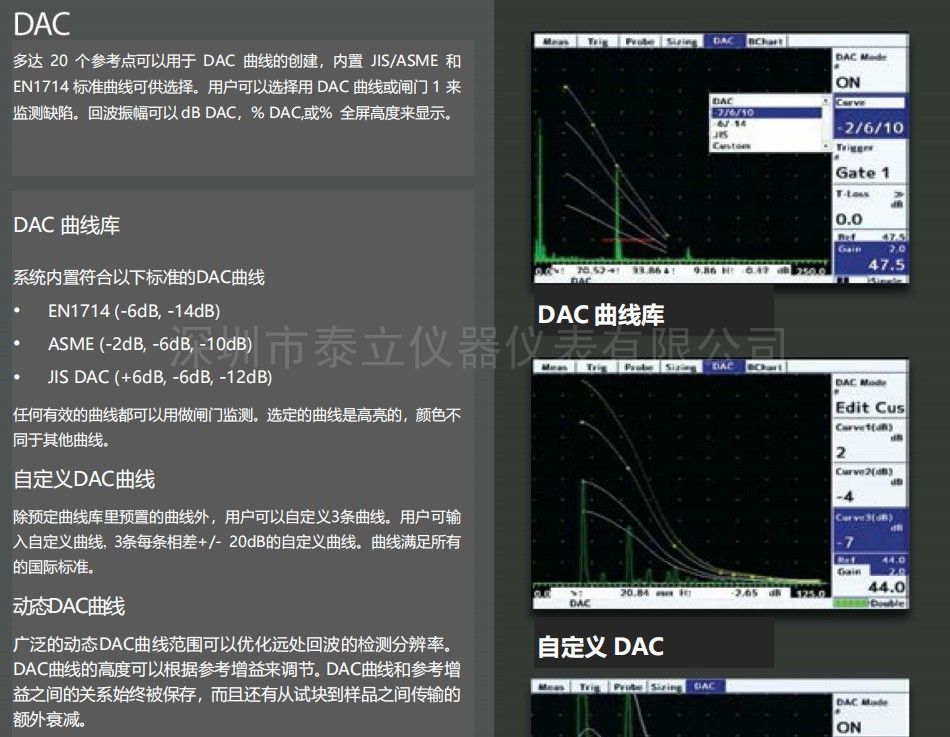 多達(dá)20個(gè)參考點(diǎn)可以用于DAC曲線的創(chuàng)建,內(nèi)置JIS/ASME 和EN1714標(biāo)準(zhǔn)曲線可供選擇。用戶可以選擇用DAC曲線或閘門1來監(jiān)測(cè)缺陷;夭ㄕ穹梢詃B DAC,% DAC,或% 全屏高度來顯示。